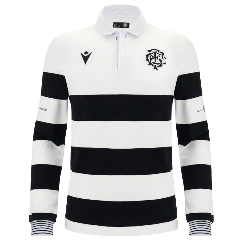 The Barbarians 2023-2024 home replica long sleeve rugby shirt in cotton. Team emblem embroidered on left chest and Macron logo on right chest.